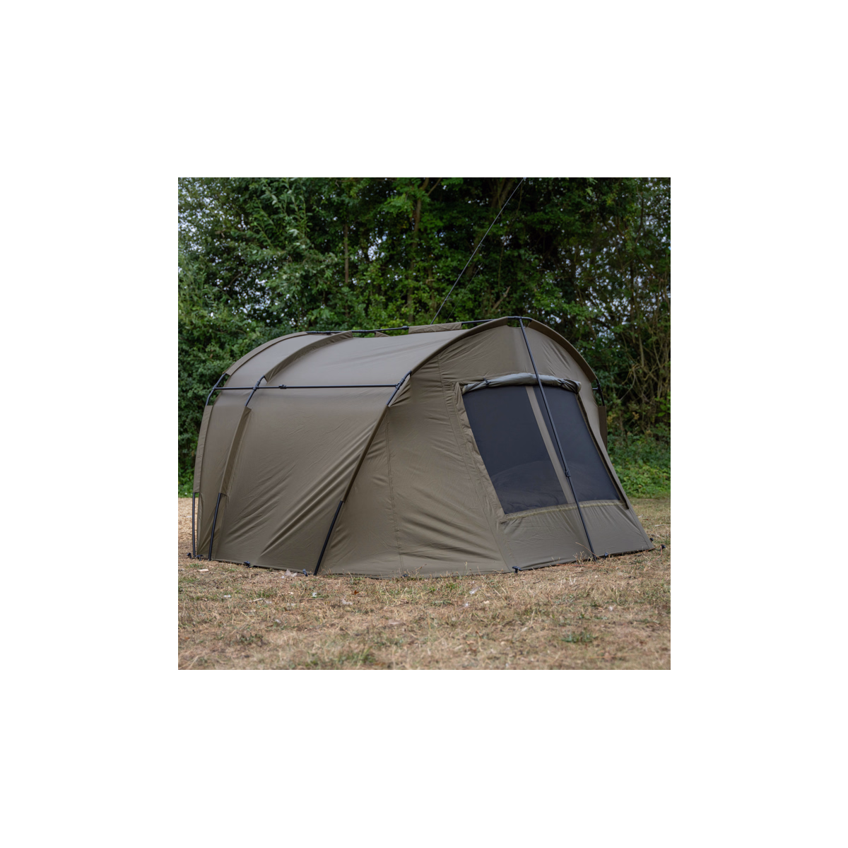 • L'avant de l'abri peut être enroulé pour créer un bivouac ouvert, tandis que la porte de style boîte aux lettres à deux sens comporte un panneau en maille intégré et une fenêtre en PVC.