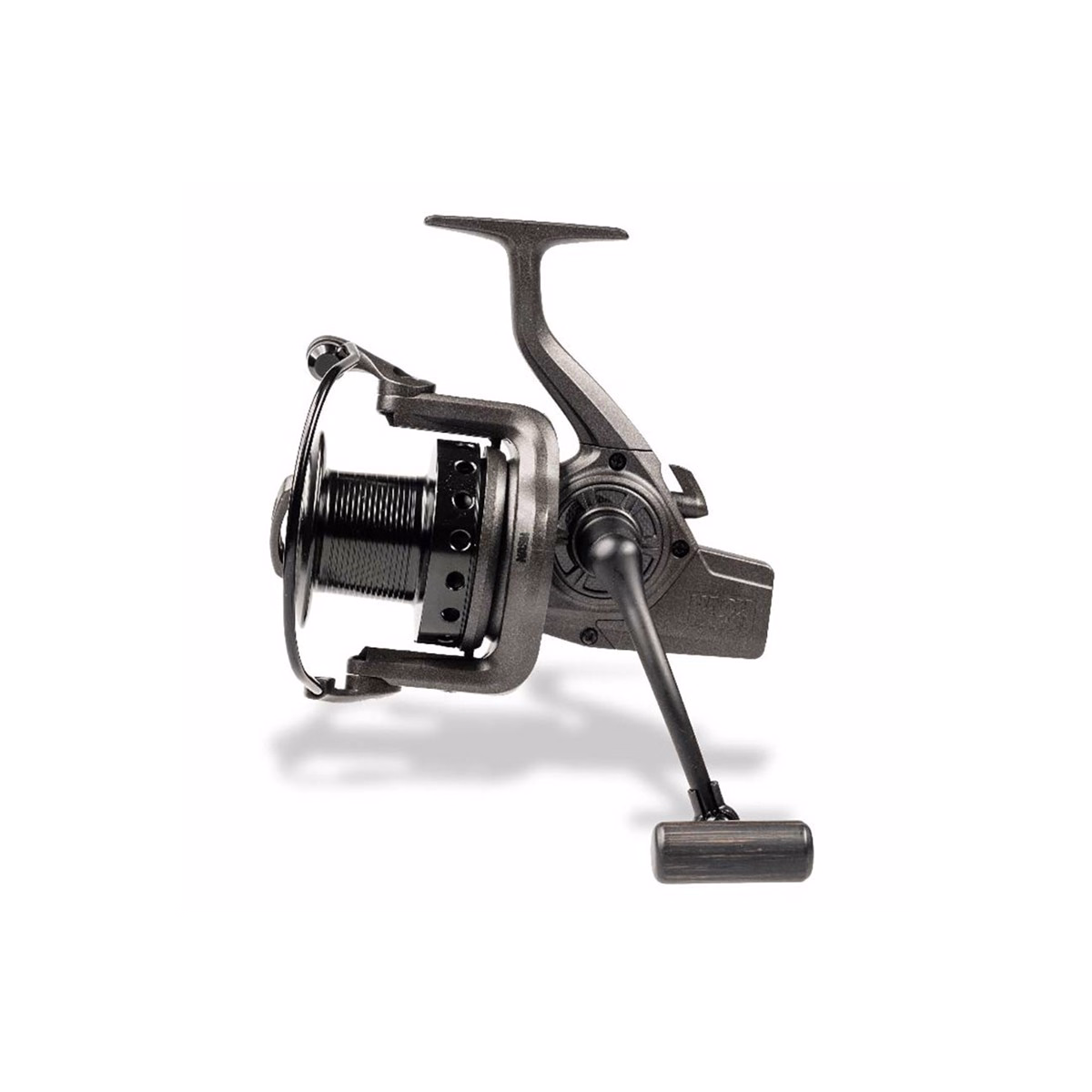 Le corps du moulinet présente une finition gunsmoke texturée, contrastant avec un design sobre en noir mat bicolore sur l’arceau, la bobine et la manivelle, avec une poignée bois en mode old school.
