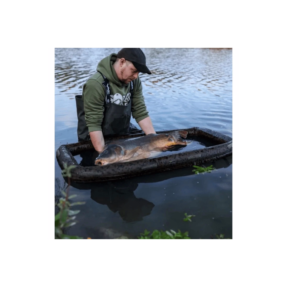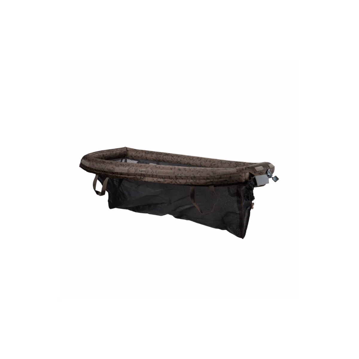 Le couvercle se ferme à l’aide d’un velcro et intègre des poches de lest pour maintenir le poisson immergé et discret pendant les photos. Quatre poignées robustes assurent une manipulation simple et sûre, tandis que la maille enduite augmente la résistance globale. Une corde de retenue réfléchissante avec fixation pour bankstick ou storm pole améliore la sécurité et la visibilité.